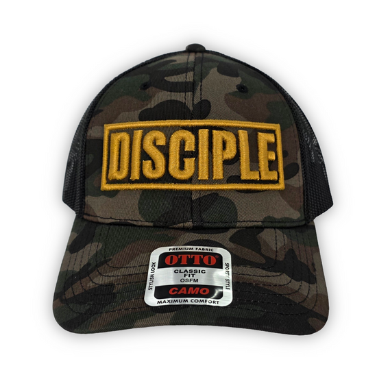 Disciple Camo Trucker Hat | Gold 3D Puff Embroidery | Christian Hat | Based Faith