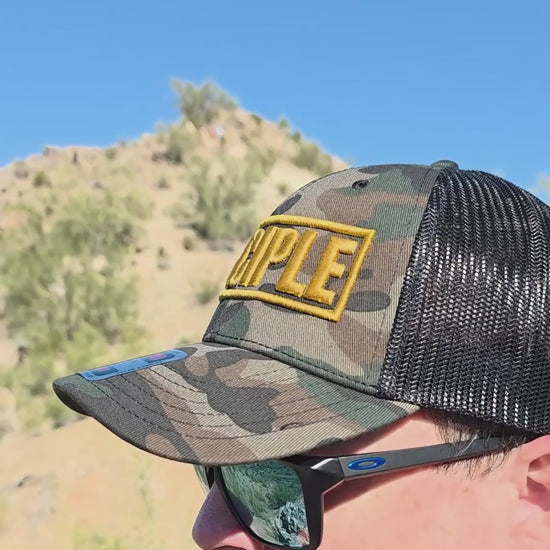 - Woodland camo front with black mesh back and gold embroidery (Camo Gold Edition)